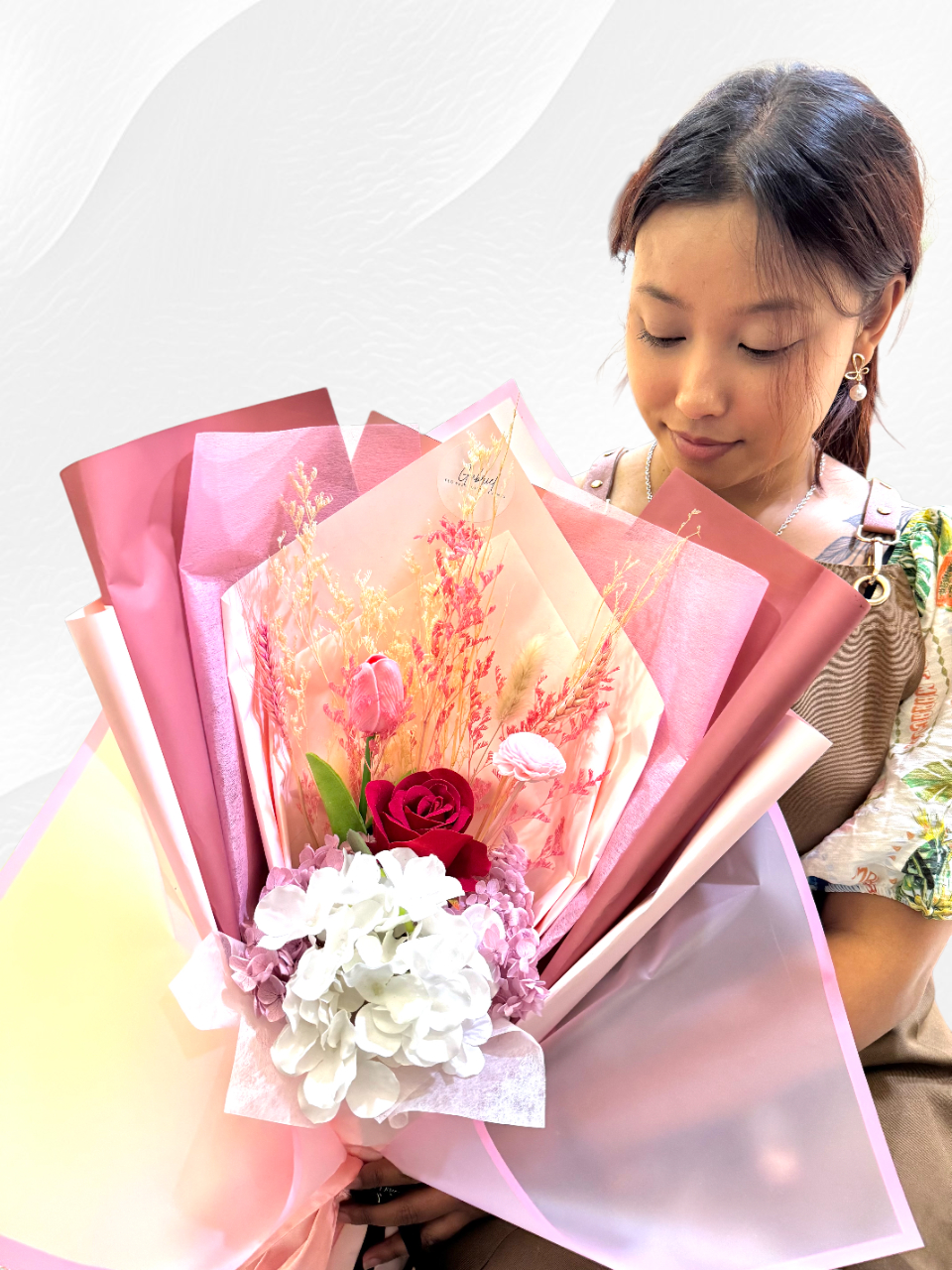 A celebration of softness, grace, and everlasting beauty. This preserved bouquet blends delicate pink tones with curated textures, creating a romantic arrangement that stays gorgeous for months without any maintenance. Wrapped in our signature blush style, Ever Pink is made for the moments you want to cherish — anniversaries, heartfelt surprises, or simply treating yourself to something timeless. A bouquet that keeps its colour, its charm, and its meaning… always.