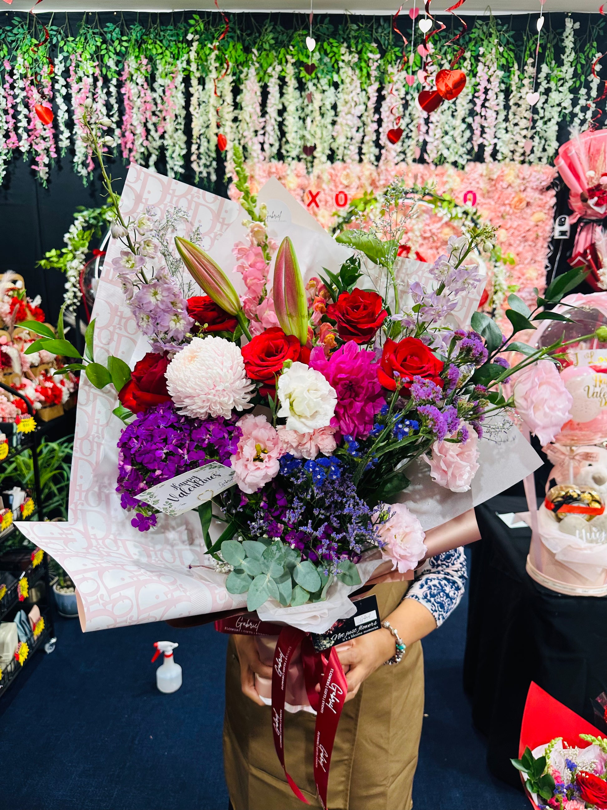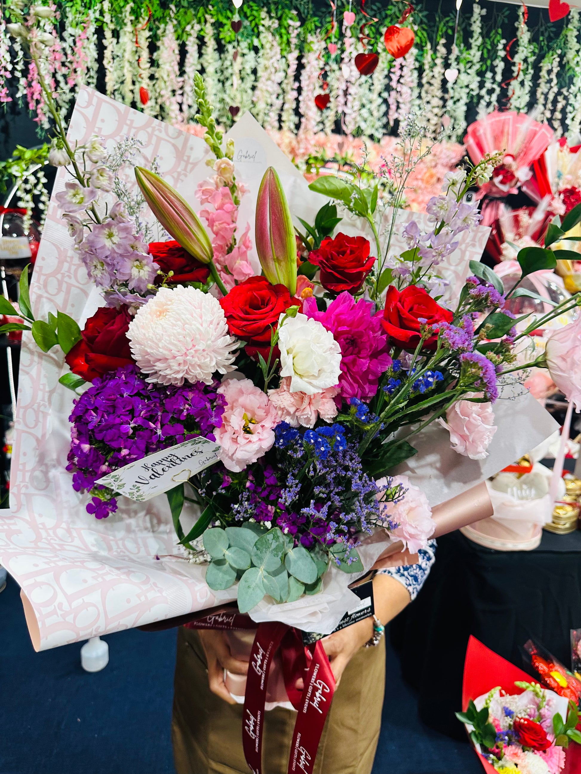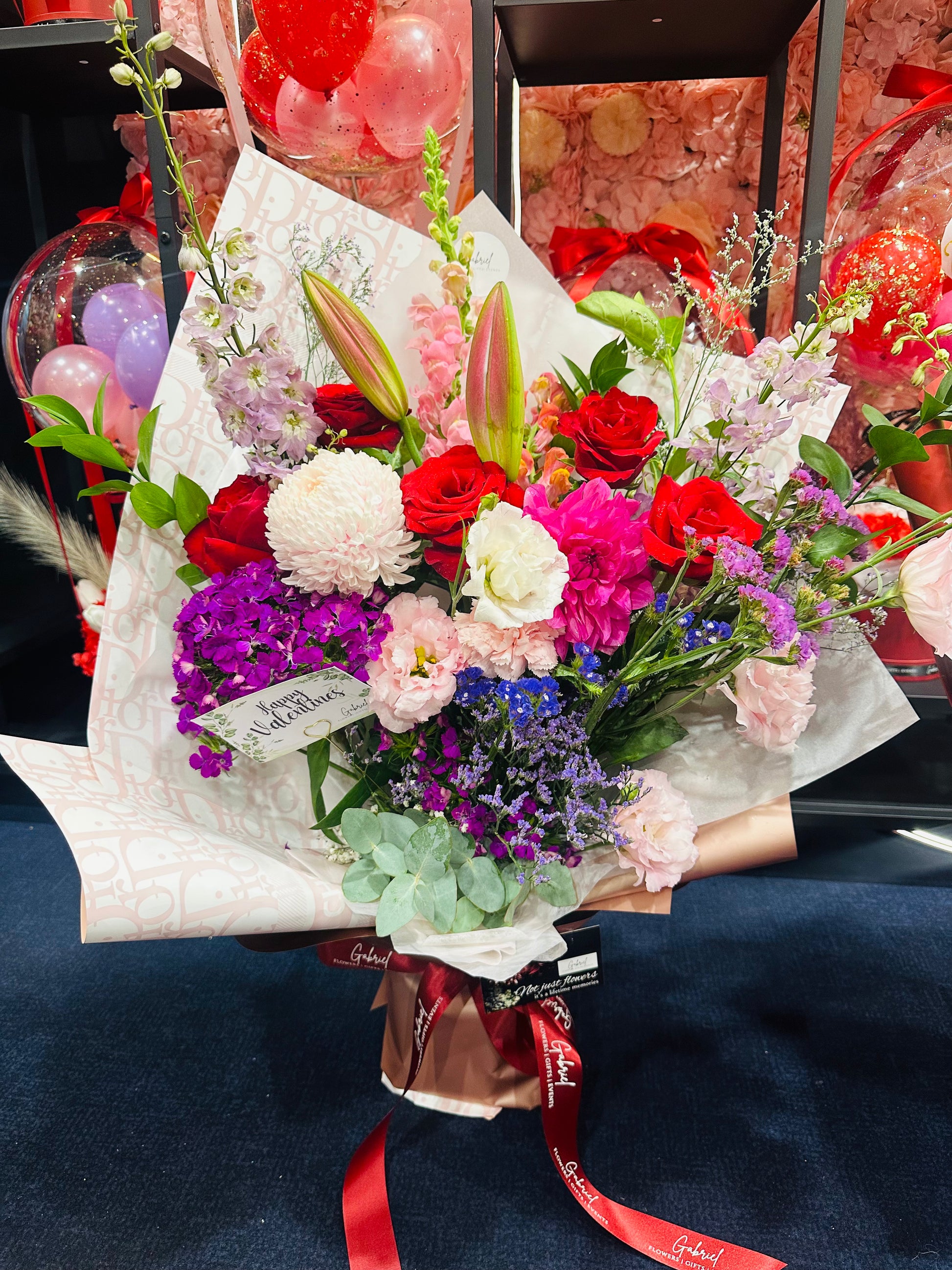 Each bloom is thoughtfully chosen to complement one another — the roses bring passion and admiration, lilies add elegance and drama, lisianthus introduces softness and movement, while mums and seasonal blooms create fullness and balance. Together, they form a premium arrangement that feels abundant, romantic, and impossible to ignore.